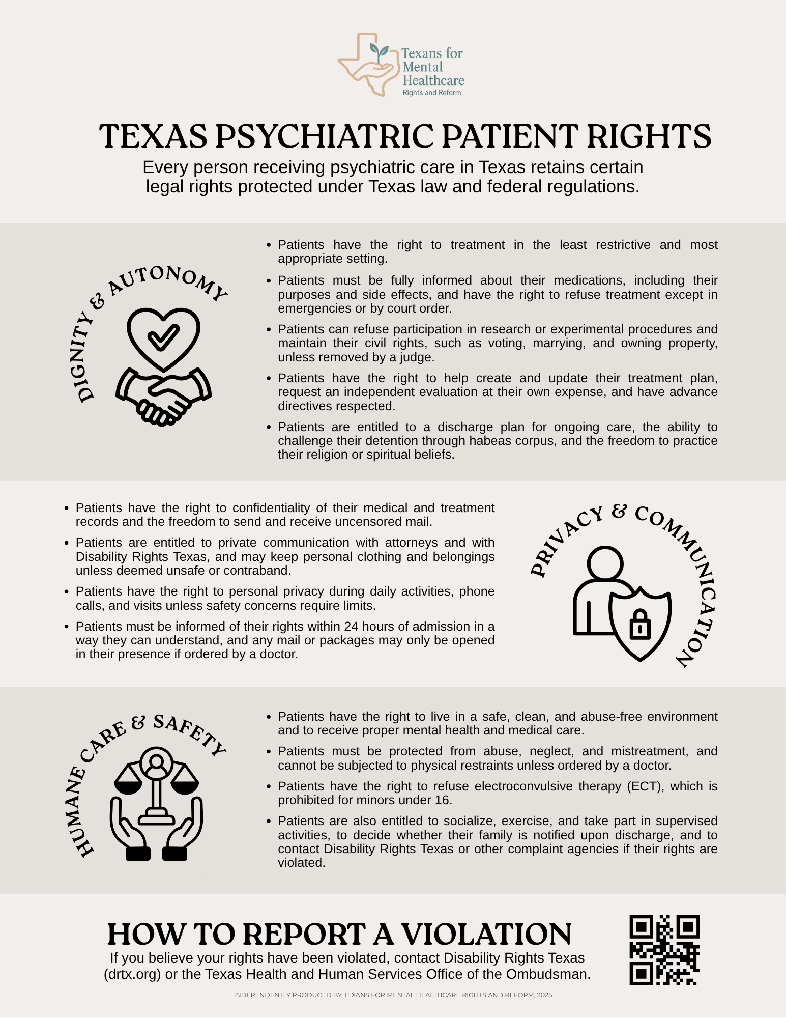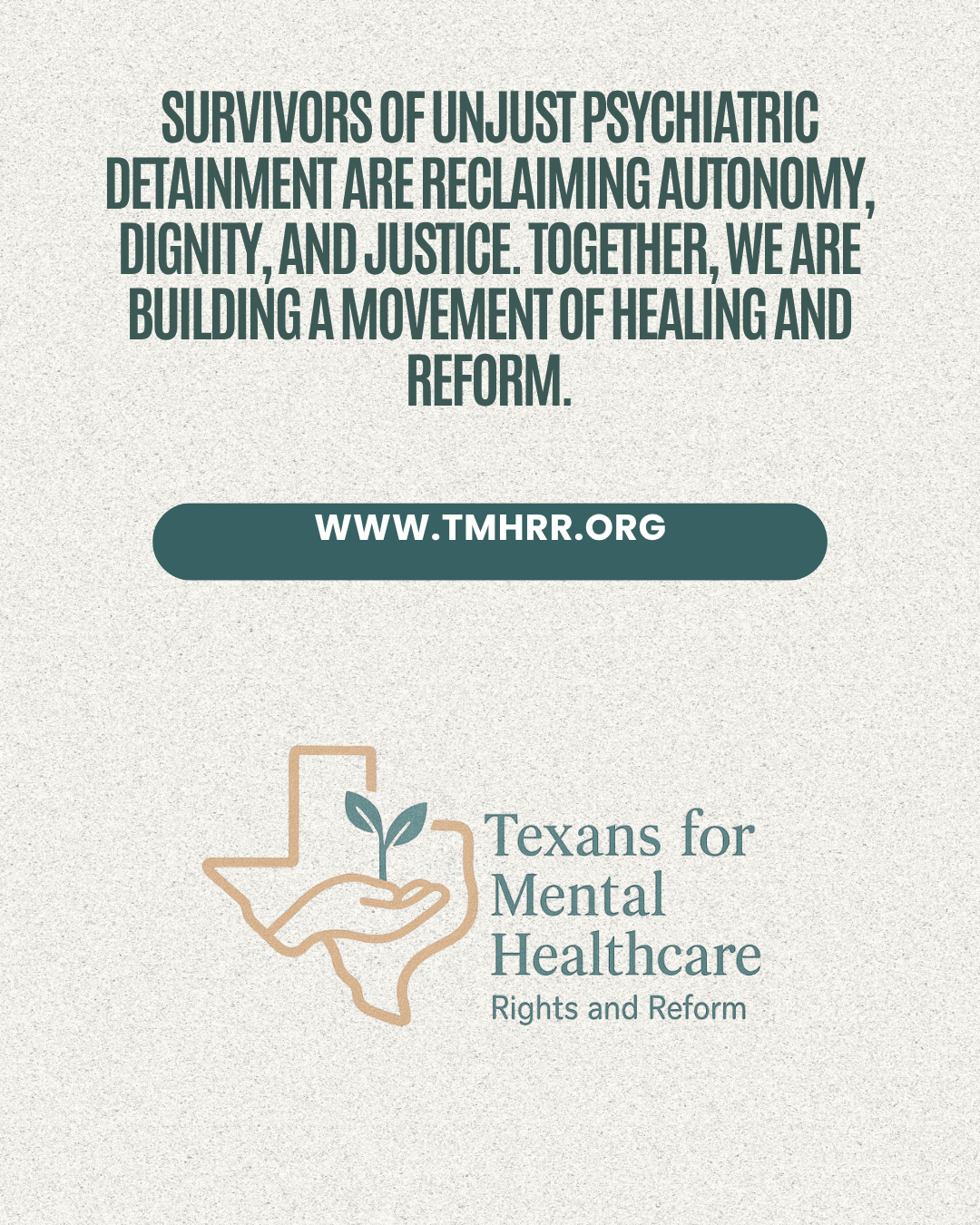 Advocate for Change: Write to lawmakers, sign petitions, or join our campaigns demanding dignity, rights, and true care in Texas mental health systems.